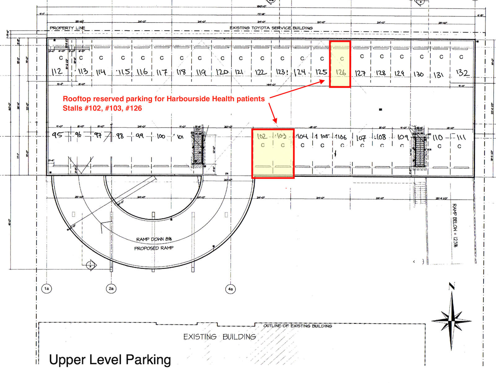 At the front of the building, you will find three 20-minute visitor parking spots. At the back of the building on the ground level, you will find five 2-hour visitor and two handicap parking spots. There are three reserved parking spots on the rooftop for Harbourside Health patients.